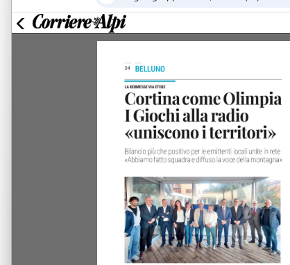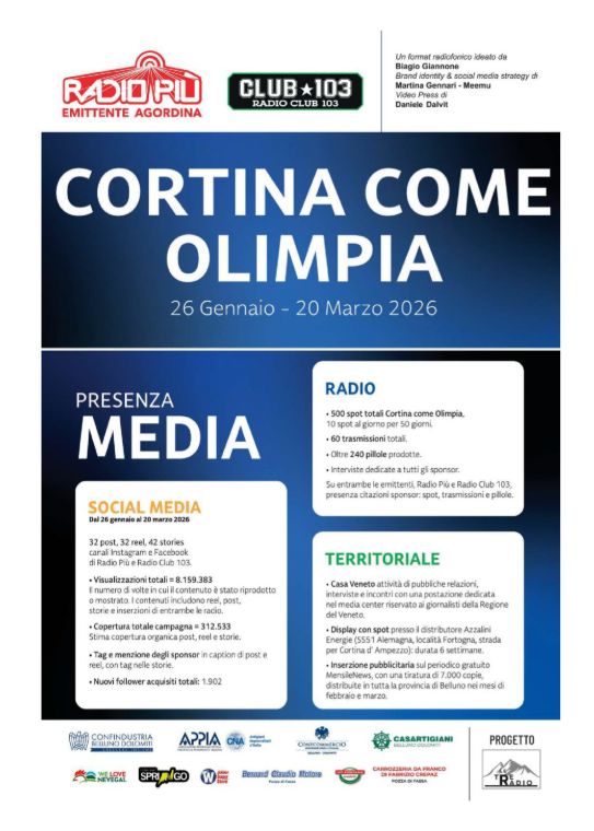 BELLUNO Nella serata dell’8 aprile 2026 a Belluno un importante incontro dei direttori de “Le tre radio”: Mirko Mezzacasa di Radio Più Emittente Agordina, Andrea Chicca di Radio Club 103 e Paolo Obber di Radio Primiero, con collaboratori e sponsor dell’ambizioso progetto Cortina come Olimpia, programma radiofonico andato in onda durante il corso di tutte le Olimpiadi e Paralimpiadi di Milano Cortina 2026, con interviste ad atleti e organizzatori del mondo olimpico paralimpico, che hanno ottenuto ben 8 milioni di visualizzazioni: un grande successo radiofonico per uno degli eventi sportivi più importanti al mondo. Obbiettivo per il futuro: Tenere alta l’asticella della comunicazione per valorizzare il territorio e per contribuire ad un incremento del turismo attraverso la bellezza della montagna, con la cultura e lo sport.