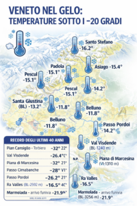 REDAZIONE Il Veneto è stato investito da una intensa ondata di gelo, con temperature ampiamente sotto lo zero registrate dalla pianura alle Dolomiti. Nella notte invernale i valori più bassi nei centri abitati hanno toccato –16,2 a Santo Stefano, –15,4 ad Asiago e circa –15 in località come Padola e Pescul. Nel Bellunese si sono registrati –13,2 a Santa Giustina e –11,8 a Belluno città. Ancora più rigido il freddo nelle aree tradizionalmente più gelide: la Piana di Marcesina ha raggiunto –23,1 gradi e Pian Cansiglio –21,8. Temperature molto basse anche in Val Visdende e alle alte quote, con punte di –21,9 sulla Marmolada. Pur senza battere record storici, il gelo resterà intenso nelle prossime ore, soprattutto nei fondovalle e nelle zone in ombra, con rischi di ghiaccio, problemi alla viabilità e possibili disagi a tubature e veicoli.