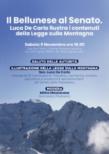 “Si tratta di una serie di appuntamenti che ho voluto promuovere nel territorio bellunese per spiegare a cittadini e amministratori quali sono le principali novità della Legge sulla Montagna: in queste serate si parlerà del futuro della nostra provincia e delle nostre genti”, spiega De Carlo. “Toccheremo tutto il territorio provinciale, dalle “terre alte” ai fondovalle, perché vogliamo comunicare al meglio un provvedimento che sì mette risorse, ma soprattutto promuove una strategia per la montagna, dando il giusto ruolo a chi qua vive, abita, lavora e vuole continuare a farlo”.