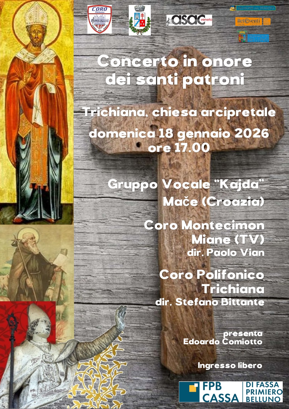 BORGO VALBELLUNA A Trichiana le celebrazioni continuano oltre l’Epifania con un concerto corale dedicato ai santi patroni. L’appuntamento è domenica 18 gennaio alle 17 nella chiesa arcipretale. L’evento, aperto alla cittadinanza, unisce per la prima volta San Felice, San Tiziano e Sant’Antonio Abate in un momento musicale condiviso. Protagonisti il Coro Polifonico Trichiana, il Coro Montecimon di Miane e il gruppo vocale femminile croato “Kajda”, in un incontro tra tradizione, cultura e musica internazionale.