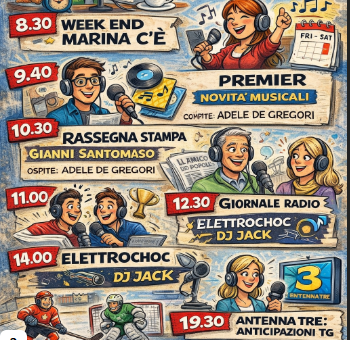 A Radio Più il sabato ha il piede schiacciato sull’acceleratore: storie, musica, sport, ospiti e notizie che arrivano puntuali, dalla colazione fino alla sera. Si parte alle 8.00, quando il caffè è ancora caldo e le idee un po’ meno, con la rassegna stampa locale firmata Mirko Mezzacasa: giornali sfogliati, titoli spiegati e quello che succede davvero intorno a noi. Alle 8.30 scatta la prima marcia con Marina Donà, che entra in onda con Week End Marina C’è: il modo migliore per iniziare a respirare aria di sabato, con sorrisi e compagnia. Alle 9.40 spazio alle orecchie più curiose con Premier, le novità musicali raccontate da Marco Gaz: brani freschi, artisti nuovi e qualche chicca da tenere tra i preferiti. Poi alle 10.30 si ritorna ai giornali, questa volta con Gianni Santomaso e la rassegna stampa de L’Amico del Popolo, impreziosita dalla presenza di Adele De Gregori: un appuntamento che mette insieme informazione e punti di vista del territorio. Alle 11.00, la parola si sposta sul ghiaccio con Hockey Al Punto Giusto: dalla Coppa Italia a Milano, Roberto Miana e Marco Gaz preparano la semifinale come due veri allenatori da panchina… radiofonica! A metà giornata, alle 12.30, arriva puntuale il Giornale Radio principale, per riordinare le idee e sapere cosa succede nel mondo, vicino e lontano. Il pomeriggio cambia ritmo alle 14.00 con Elettrochoc, la musica che batte forte e non chiede permesso, mixata e servita da DJ Jack. E per chiudere in bellezza, appuntamento serale alle 19.30: Antenna Tre porta in anticipo le notizie del telegiornale con Tiziana Bolognani, così sapete cosa vi aspetta ancor prima dell’onda TV.