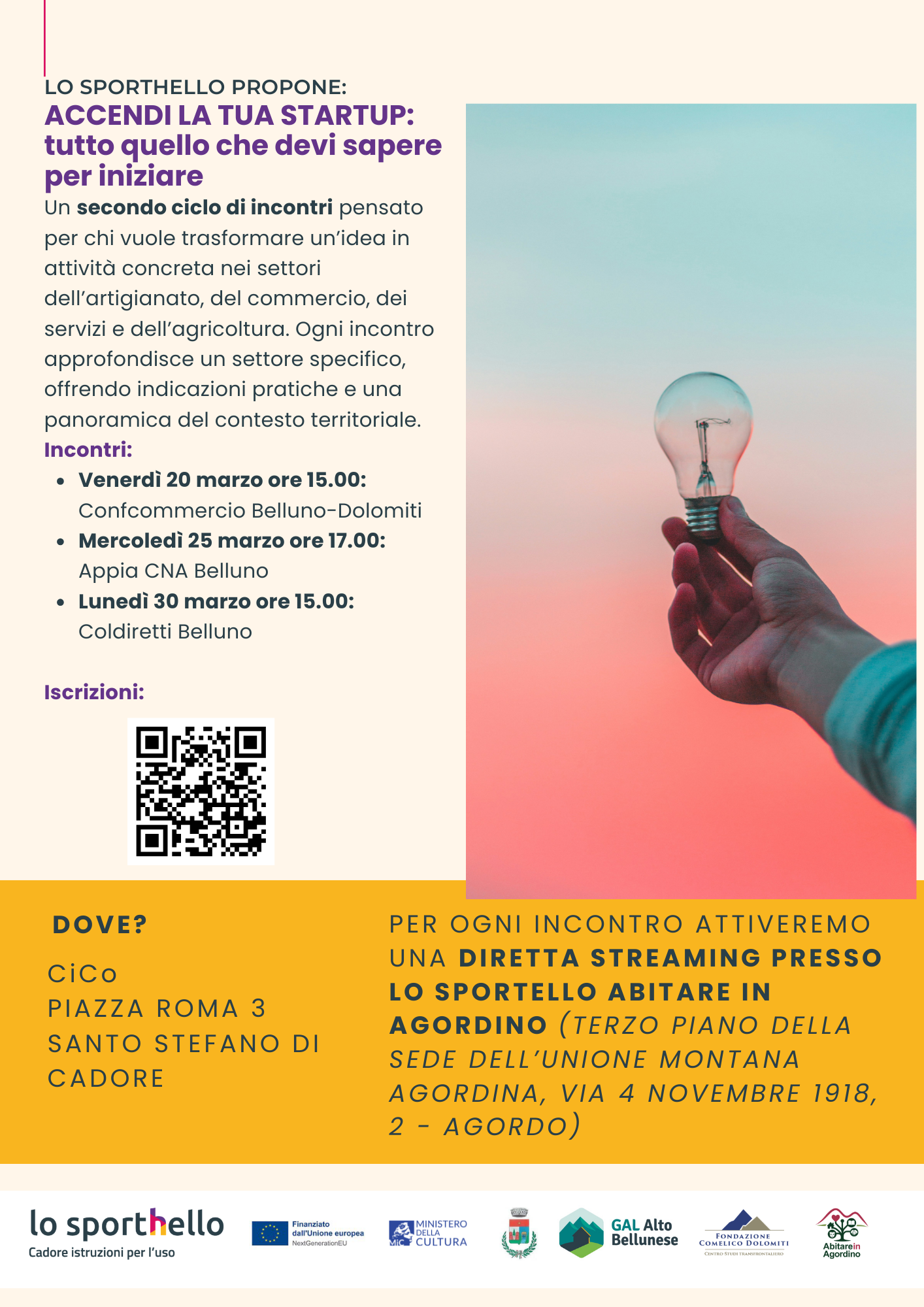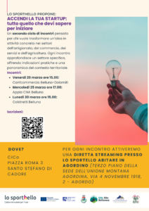 AGORDO Lo sportello Abitare in Agordino ospiterà in diretta streaming il ciclo di incontri “Accendi la tua startup”, organizzato da SportHello. L’iniziativa si propone di fornire informazioni utili per l’apertura di nuove attività, con approfondimenti su finanziamenti, requisiti e opportunità nei settori dell’artigianato, dell’industria e dell’agricoltura. Gli incontri vedranno la partecipazione di esperti del settore e si terranno al 3° piano dell’Unione Montana Agordina a Agordo. Il calendario prevede tre appuntamenti: venerdì 20 marzo alle 15.00 con Confcommercio Belluno-Dolomiti, mercoledì 25 marzo alle 17.00 con Appia CNA Belluno e lunedì 30 marzo alle 15.00 con Coldiretti Belluno. L’iniziativa offre strumenti pratici e consigli per chi desidera avviare una startup in Agordino.