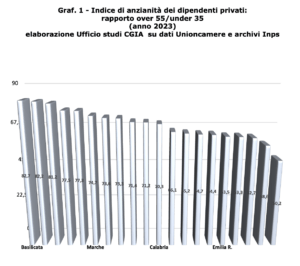 Con tanti pensionati e pochi giovani, anche le imprese sono in seria difficoltà. Reperire sul mercato del lavoro figure professionali altamente specializzate è ormai diventata un’impresa quasi impossibile. Ad oggi, la regione che presenta l’indice di anzianità dei dipendenti privati più elevato d’Italia è la Basilicata (82,7). Seguono la Sardegna (82,2), il Molise (81,2), l’Abruzzo (77,5) e la Liguria (77,3). Il dato medio nazionale è pari al 65,2. Le regioni meno “colpite” da questo fenomeno – anche se già da alcuni anni sono costrette comunque a fare i conti con questa criticità – sono l’Emilia Romagna (63,5), la Campania (63,3), il Veneto (62,7), la Lombardia (58,6) e il Trentino Alto Adige (50,2). In buona sostanza, nella nostra regione il fenomeno è meno “impattante” che in molte altre aree del Paese, tuttavia i dati ci segnalano che ogni 100 dipendenti che lavorano in Veneto con meno di 35 anni, ve ne sono 62,7 che hanno oltre 55 anni (vedi Graf. 1).