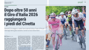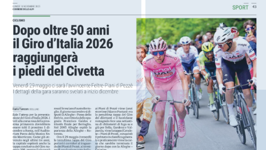 ALLEGHE Sale l’attesa per la presentazione ufficiale del Giro d’Italia 2026, che sarà svelato il 1° dicembre a Roma. La 109ª edizione scatterà il 9 maggio dalla Bulgaria e si concluderà, come da tradizione, nella capitale. Ma la grande notizia per il Bellunese è il ritorno della corsa rosa ad Alleghe, con un arrivo spettacolare ai Piani di Pezzè, previsto per venerdì 29 maggio. Sarà una tappa tutta bellunese, con partenza da Feltre e arrivo ai 1.470 metri dei Piani di Pezzè, al termine di una salita di 5,1 chilometri e 487 metri di dislivello, con pendenza media del 9,5%. Prima dell’ascesa finale, i corridori dovranno affrontare Passo Duran e Passo Staulanza, rendendo la frazione una delle più dure e spettacolari del Giro. L’ultima volta che Alleghe aveva ospitato un traguardo era il 1975, con la vittoria del belga Roger De Vlaeminck. Nel 2005 il paese fu invece sede di partenza.