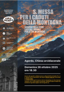 AGORDO Domenica 26 ottobre 2025, alle 18.30, la Chiesa Arcidiaconale di Agordo ospiterà la tradizionale Santa Messa per i Caduti della Montagna, un appuntamento toccante che ogni anno riunisce la comunità agordina per rendere omaggio a coloro che hanno perso la vita tra le vette. L’iniziativa, promossa dal Coro Agordo dell’Associazione Filarmonica Agordina, vede la collaborazione di numerose realtà del territorio: Club Alpino Italiano – Sezione Agordina, Pieve Arcidiaconale di Agordo, Gruppo Rocciatori “Giri” Agordo, Gruppo Rocciatori “Val Biois”, Corpo Nazionale Soccorso Alpino e Speleologico – Vallata Agordina, Associazione Nazionale Alpini – Gruppo Agordo-Rivamonte-Taibon, con il prezioso supporto di Radio Più. La celebrazione sarà accompagnata dai canti del Coro Agordo, che interpreterà anche il celebre brano “Signore delle cime, lasciali andare per le Tue montagne”, simbolo di questo momento di raccoglimento e memoria. La Messa verrà trasmessa in diretta radiofonica su Radio Più e anche in diretta video su canali social dell’emittente agordina.