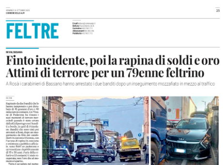 PEDAVENA Attimi di terrore per un 79enne di Pedavena, rapinato mercoledì pomeriggio dopo essere stato tamponato a Primolano da due malviventi a bordo di una Kia Sportage nera. L’uomo trasportava 45 grammi d’oro e 40 mila euro in contanti, destinati all’azienda orafa del figlio a Feltre. Scendendo dall’auto per verificare i danni, è stato aggredito e derubato del borsello dai due banditi, poi fuggiti lungo la Valsugana. Dopo un inseguimento da film, i carabinieri hanno fermato la Kia a Rosà: i due, un padovano di 35 anni e un veneziano di 30, sono stati arrestati e rinchiusi nel carcere di Vicenza con l’accusa di rapina in concorso e resistenza a pubblico ufficiale.