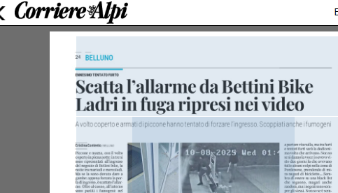 BELLUNO Nella notte tra martedì 7 e mercoledì 8 ottobre tre malviventi hanno tentato un furto al negozio Bettini Bike di Belluno. Le telecamere di sorveglianza li hanno ripresi mentre, con volto coperto e armati di picconi e mazze, cercavano di forzare la porta d’ingresso. L’azione è però fallita grazie al tempestivo intervento del sistema di sicurezza: l’allarme, collegato ai metronotte, è scattato immediatamente, attivando anche i fumogeni interni. Sorprendendo i ladri e impedendo il colpo, il sistema ha costretto i tre a una rapida fuga. Indagini in corso da parte delle forze dell’ordine per individuare i responsabili.