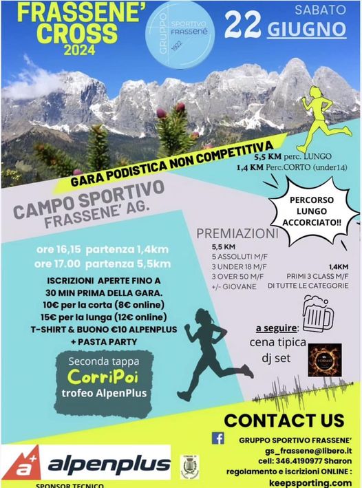 Preparatevi a scatenare la vostra energia e a superare i vostri limiti con CorriPoi 2024. Il trofeo di Corse Podistiche a tappe Nell’Agordino, quattro tappe emozionanti, ognuna delle quali vi porterà a scoprire le bellezze naturali del territorio. 22 GIUGNO FRASSENE’, 7 LUGLIO FORCELLA AURINE, 7 SETTEMBRE VOLTAGO Alla CorriPoi parteciperanno, fianco a fianco, forti runner, atleti della domenica, famiglie, gruppi di amici, giovani corridori in erba, tutti con l’obiettivo di correre e di divertirsi. Corri verso la vittoria, corri verso il trofeo Alpenpluss. Regolamento delle quattro gare sul sito KEEPSPORTING.COM, in collaborazione con Kiwi Sport, abbigliamento sportivo per tutta la famiglia, ad ALLEGHE- CENCENIGHE – BELLUNO