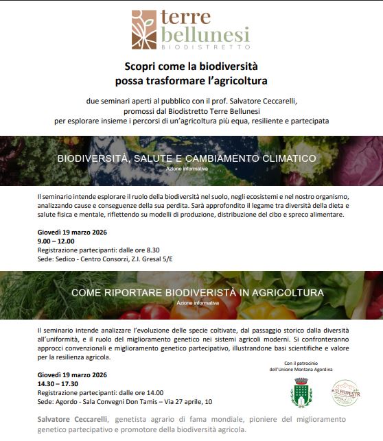 SEDICO/AGORDO La biodiversità come chiave per un’agricoltura più resiliente, sostenibile e partecipata. È questo il tema al centro dei due seminari pubblici promossi dal Biodistretto Terre Bellunesi con il contributo del Ministero dell’Agricoltura, della Sovranità Alimentare e delle Foreste (MASAF). Protagonista degli incontri sarà il professor Salvatore Ceccarelli, genetista agrario di fama mondiale e pioniere del miglioramento genetico partecipativo, da anni impegnato nella promozione della biodiversità agricola. Il primo seminario si terrà giovedì 19 marzo dalle 9 alle 12 al Centro Consorzi di Sedico (zona industriale Gresal), con registrazione dei partecipanti dalle 8.30. L’incontro approfondirà il ruolo della biodiversità nel suolo, negli ecosistemi e nell’organismo umano, analizzando le cause e le conseguenze della sua progressiva perdita. Sarà inoltre esplorato il legame tra diversità della dieta, salute fisica e mentale e modelli di produzione e distribuzione del cibo. Il secondo appuntamento è previsto lo stesso giorno ad Agordo, dalle 14.30 alle 17.30 nella sala convegni Don Tamis. Il focus sarà sull’evoluzione delle specie coltivate e sul confronto tra miglioramento genetico convenzionale e approcci partecipativi.