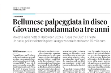 BELLUNO Condannato a tre anni di reclusione e 15 mila euro di risarcimento un 31enne triestino per violenza sessuale su una 21enne bellunese, avvenuta la notte di Halloween 2024 nella discoteca “Deus The Club” di Trieste. Il giudice ha riconosciuto la minore gravità del fatto, accogliendo parzialmente la tesi difensiva, ma respingendo la richiesta di assoluzione. L’uomo, incensurato, nega gli abusi e punta a scontare la pena fuori dal carcere.
