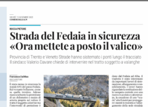 ROCCA PIETORE Il Comune di Rocca Pitore informa che la strada Santa Maria–Caracoi è nuovamente aperta. La ditta incaricata ha completato oggi tutti i sondaggi, rendendo superflua la chiusura fino a mercoledì. Nei prossimi giorni è previsto un importante taglio boschivo per rimuovere le piante bostricate lungo i versanti della strada, considerate potenzialmente pericolose. Tale intervento comporterà una nuova chiusura temporanea, di cui sarà data tempestiva comunicazione non appena verrà definita la data di inizio lavori. L’amministrazione comunale si scusa per i disagi, sottolineando che le misure adottate garantiscono la sicurezza della viabilità locale.