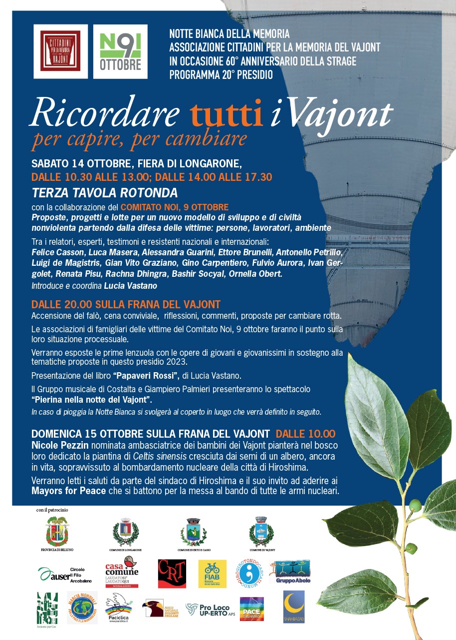 LONGARONE In occasione del 60° Anniversario della strage del Vajont l’Associazione Cittadini per la Memoria del Vajont e comitato Noi, 9 Ottobre, con la collaborazione di numerose associazioni, è stato messo a punto un programma per stimolare la Memoria, cioè quella che chiama ad agire per impedire che le stragi continuino, accettate come un’indispensabile tributo allo sviluppo della società. L’Associazione Cittadini per la Memoria del Vajont e Comitato Noi, 9 Ottobre nel 2020 hanno preparato un appello con proposte per invertire la rotta, proposte concrete e che, se attuate, sicuramente aiuterebbero sia a ridurre le morti, ma anche a fare in modo che i famigliari delle vittime riescano ad ottenere nei processi verità e giustizia per i loro cari.