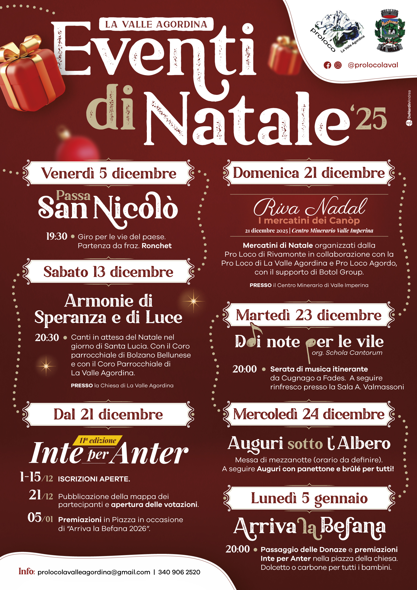 LIVINALLONGO Lunedì 22 dicembre 2025, alle ore 20.30, nella Chiesa della SS. Trinità di Andraz, si terrà il Concerto di Natale proposto dal Coro Femminile Col di Lana. Una serata dedicata ai canti natalizi e alla tradizione popolare, diretta da Anna Devich e presentata da Denni Dorigo. Il programma prevede anche un intermezzo musicale con il Trio di Ottoni della Banda da Fodom. Un appuntamento aperto a tutta la comunità, all’insegna della musica e dell’atmosfera natalizia.