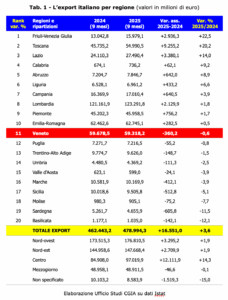 Insomma, nei primi nove mesi dell’anno l’export del Veneto è in controtendenza rispetto al dato nazionale. I dazi introdotti dall’amministrazione Trump, i venti di guerra che soffiano in Europa e le difficoltà del commercio mondiale hanno frenato – più che nel resto d’Italia – le nostre vendite all’estero. Nonostante ciò non dobbiamo preoccuparci più del dovuto. I nostri manufatti sono di alta gamma e i produttori di queste eccellenze possono superare questa fase di difficoltà perché non chiedono aiuti, sussidi o contributi, ma un fisco più equo, infrastrutture pubbliche più