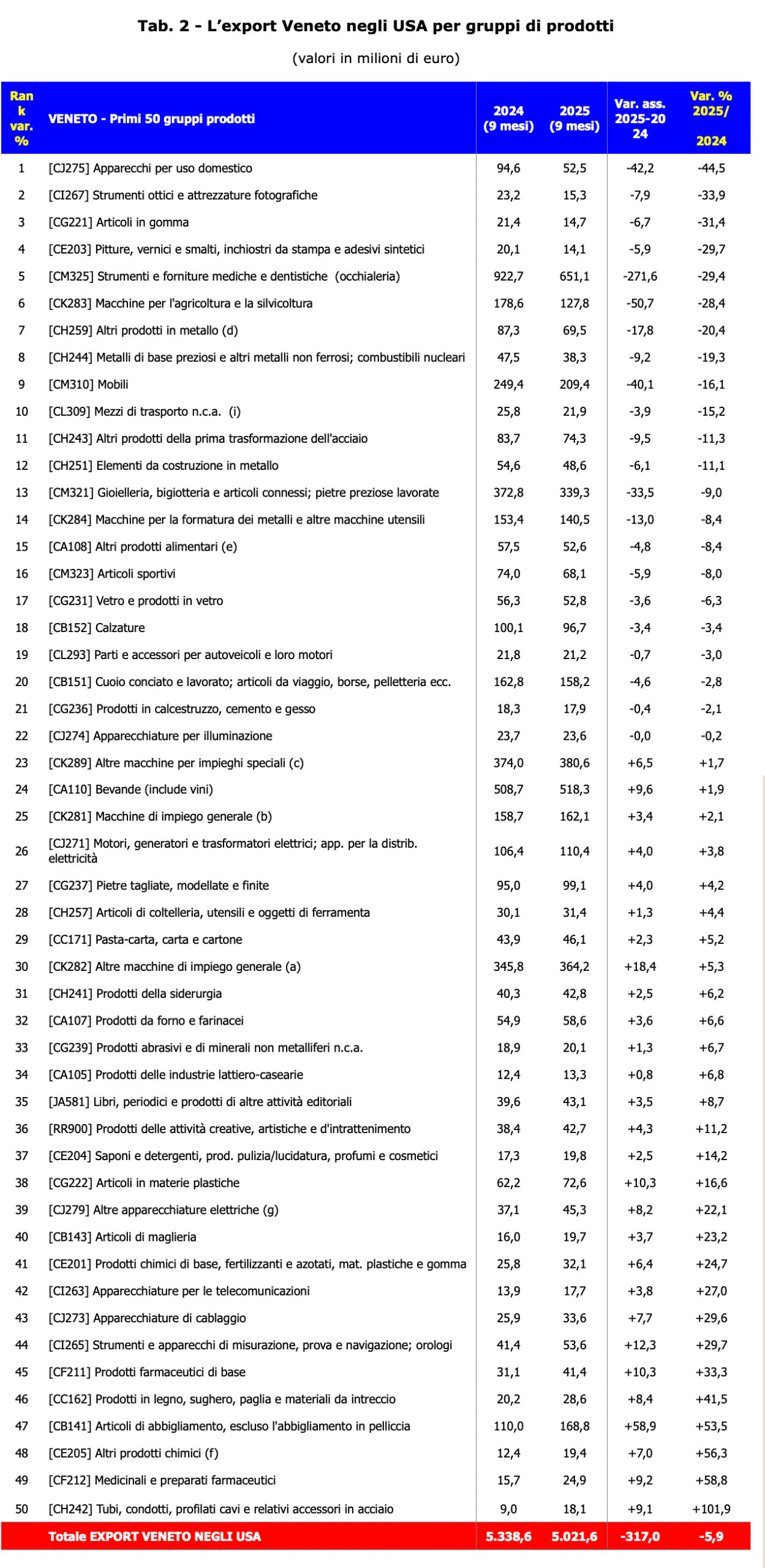 Se, come dicevamo più sopra, a livello regionale le nostre esportazioni nel mondo sono scese dello 0,6 per cento, molto più pesante è stata la contrazione registrata verso il mercato statinutense. Sempre tra gennaio e settembre 2025 rispetto allo stesso arco temporale del 2024, la flessione è stata addirittura del 5,9 per cento. Insomma, l’introduzione dei dazi ha pesantemente ostacolato le nostre esportazioni verso gli USA che, in termini assoluti, sono diminuite di 317 milioni di euro. Se Padova (+9,5 per cento) e Rovigo (+2,7) hanno accresciuto le quote di mercato negli States, Verona (-6,2), Treviso (-6,9) e in particolare Belluno (-35,1) sono “crollate” (vedi Tab. 3).