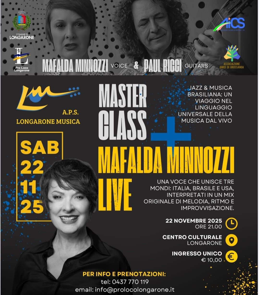 LONGARONE La scuola di musica di Longarone propone un evento speciale aperto al territorio: il concerto della cantante internazionale Mafalda Minnozzi insieme al chitarrista newyorkese Paul Ricci. Jazz e bossa nova si incontrano in una serata unica sabato 22 novembre alle 21.00. Nella stessa giornata si terrà anche una masterclass dedicata a cantanti e chitarristi. Le prevendite sono disponibili presso la Pro Loco.