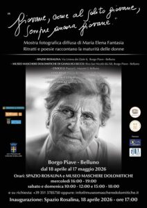 BELLUNO Dal 18 aprile al 17 maggio 2026 a Belluno si svolge una mostra fotografica diffusa di Maria Elena Fantasia dedicata alla maturità femminile. Il progetto, intitolato “Giovane, come al solito giovane, sempre ancora giovane”, unisce ritratti e poesie per raccontare storie di donne e il loro percorso di vita. L’esposizione è distribuita in più sedi del Borgo Piave, trasformando il quartiere in un itinerario culturale tra spazi espositivi e attività locali. Le opere sono visibili in diverse location cittadine e invitano a riflettere su tempo, identità e bellezza. L’inaugurazione è prevista il 18 aprile alle 17.00 con visite su richiesta.