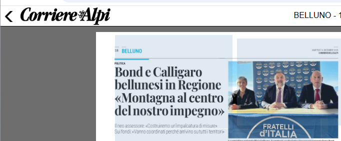 Bond entra in giunta come assessore con deleghe a montagna, agricoltura, caccia, pesca e demanio idrico; Calligaro subentra in consiglio regionale. Per Fratelli d’Italia è un risultato definito “straordinario”, che segna la crescita del partito e garantisce attenzione costante ai territori montani.
