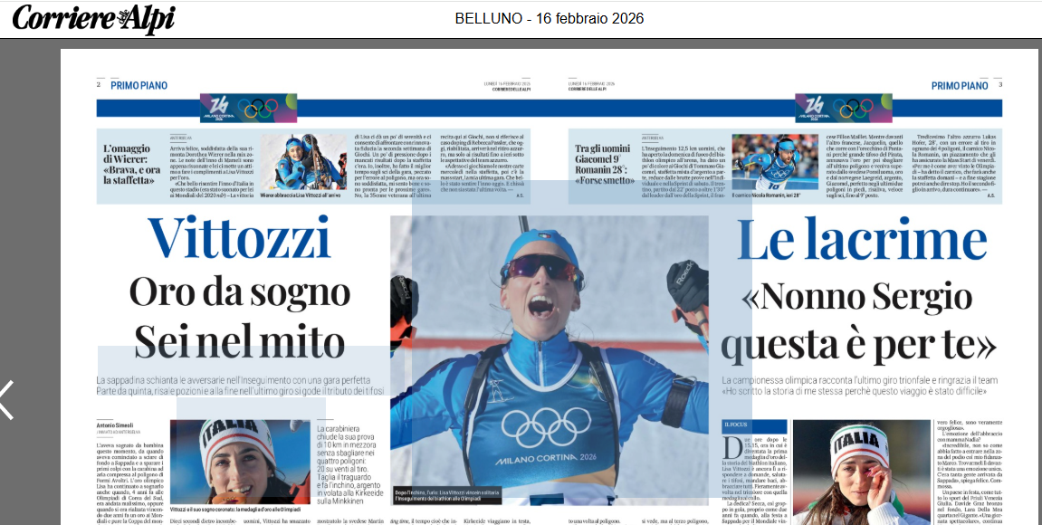 CORTINA Una domenica olimpica memorabile esalta le Dolomiti bellunesi ai Giochi olimpici invernali Milano Cortina 2026. L’oro di Federica Brignone a Cortina, dopo il successo nel superG, e quello di Lisa Vittozzi ad Anterselva nel biathlon rappresentano capolavori sportivi e umani che danno energia al territorio. Emozionante anche il bronzo nella staffetta di sci di fondo con Elia Barp e Davide Graz. Lorraine Berton sottolinea il valore sportivo, organizzativo e promozionale dell’evento, mentre il presidente della Provincia Roberto Padrin evidenzia l’efficienza della macchina organizzativa e l’orgoglio per atleti cresciuti tra le Dolomiti. Cortina si conferma palcoscenico ideale, con una provincia aperta e accogliente. I Giochi stanno rafforzando l’immagine internazionale del territorio, proiettandolo con fiducia verso le sfide future.