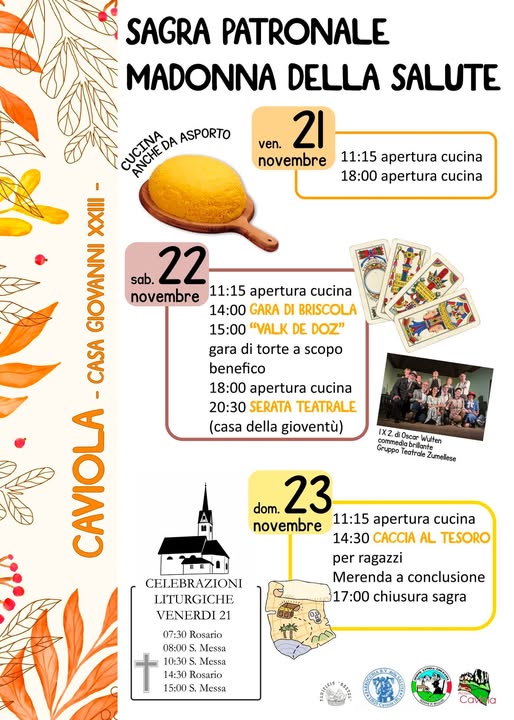 FALCADE Torna a Caviola di Falcade la tradizionale Sagra della Madonna della Salute, organizzata dal Gruppo Alpini Cime d’Auta, Parrocchia e Pro Loco di Caviola, in programma da venerdì 21 a domenica 24 novembre. Tre giorni all’insegna della devozione, dell’amicizia e dei sapori autentici. Venerdì, alla chiesa della Madonna della Salute, si terranno messe, rosari e momenti di preghiera. Tutti i giorni, dalle 11.15 e dalle 18, sarà attiva la cucina tipica, anche da asporto. Sabato pomeriggio dalle 14, spazio al divertimento con la gara di briscola e il concorso di torte “Valk de doz”. Domenica dalle 14.30, caccia al tesoro e merenda per i più giovani. Non mancherà la pesca di beneficenza per tutta la durata della sagra.
