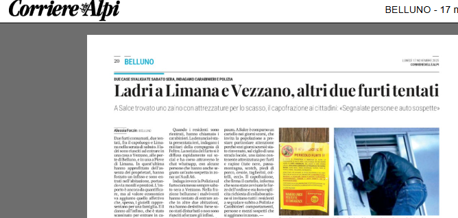 BELLUNO – Una nuova ondata di furti ha colpito il territorio sabato sera, tra il capoluogo e Limana. In totale si sono registrati due furti riusciti e due tentativi, con un modus operandi rapido e mirato che sta generando crescente preoccupazione tra i cittadini. A Vezzano, alle porte di Belluno, i ladri sono riusciti a introdursi in un’abitazione approfittando dell’assenza dei proprietari. Hanno forzato un infisso e portato via gioielli e monili, oggetti dal valore non solo economico ma anche affettivo. Un colpo analogo è stato messo a segno a Pieve di Limana, dove i malviventi hanno agito con le stesse modalità. In entrambi i casi, al rientro i residenti hanno subito allertato i Carabinieri della compagnia di Feltre, che ora stanno conducendo le indagini. Sui social, intanto, si è diffusa la segnalazione di un’auto sospetta: un’Audi A6 vista aggirarsi in zona. A Vezzano, inoltre, i ladri hanno tentato di entrare in altre due case, senza riuscire a forzare gli infissi o forse disturbati da qualche movimento nelle vicinanze. Su questo fronte indaga la Polizia. Il clima di timore cresce soprattutto in città: a Salce è comparso un cartello che invita alla massima attenzione dopo il ritrovamento, sul ciglio di una strada, di uno zaino contenente attrezzi per furti e rapine – passamontagna, tute nere, scotch, cesoie, coltelli e altri strumenti. Il capofrazione ha avvisato la comunità e ribadito la richiesta delle forze dell’ordine: segnalare immediatamente ogni presenza sospetta. Un appello alla collaborazione per tentare di arginare un fenomeno che, ancora una volta, mette alla prova la sicurezza dei quartieri.