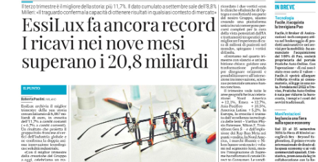 ESSILORLUXOTTICA, MIGLIOR TRIMESTRE DI SEMPRE CON FATTURATO +11,7%