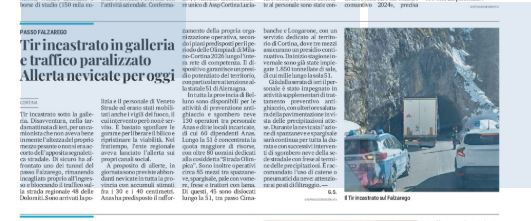 PASSO FALZAREGO Ieri mattina mezzo pesante incastrato lungo la Regionale 48 nel territorio di Cortina. Sul posto Veneto Strade, Forze dell’Ordine e Vigili del Fuoco per liberare il bilico e ripristinare la viabilità. Disagi e rallentamenti, ma situazione risolta in poco tempo.