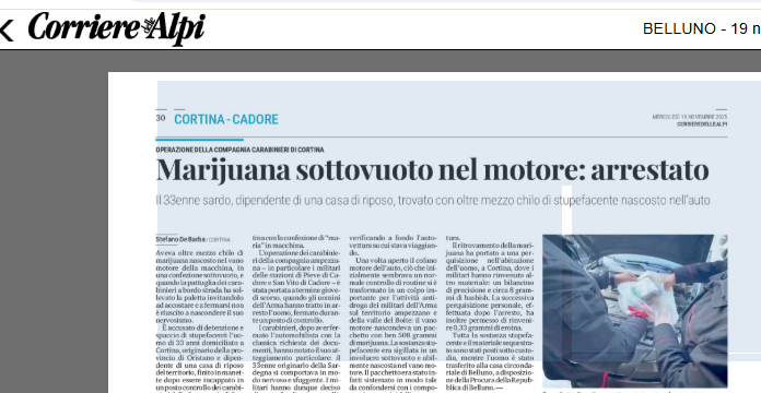 CORTINA Il Comando Provinciale dei Carabinieri di Belluno ha reso noto l’arresto di M C, 33 anni, originario di Oristano e residente a Marrubiu, fermato il 13 novembre 2025 a Cortina d’Ampezzo durante un’operazione coordinata dalle Stazioni di Pieve di Cadore e San Vito di Cadore. L’uomo è stato tratto in arresto con l’accusa di detenzione e spaccio di sostanze stupefacenti, nell’ambito di un’attività di controllo del territorio che ha portato i militari a intervenire rapidamente e a trovare elementi ritenuti idonei per procedere al fermo. Un intervento deciso, spiegano i Carabinieri, che rientra nella costante azione di contrasto al fenomeno dello spaccio nelle aree montane e turistiche della provincia.