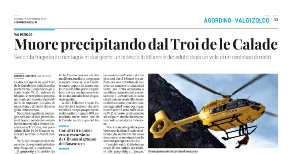 ESCURSIONISTA TEDESCO PRECIPITA E MUORE NEL GRUPPO DEL BOSCONERO