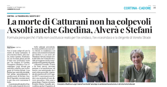 Belluno – Nessun colpevole per la morte di Carla Catturani, travolta dalla frana di Alverà nella notte tra il 4 e il 5 agosto 2017. Il giudice Paolo Velo ha assolto con formula piena l’ex sindaco di Cortina Gianpietro Ghedina, l’ex vicesindaco Luigi Alverà e la dirigente di Veneto Strade Lara Stefani: per loro il fatto non costituisce reato. Già nel primo processo era stato assolto anche il predecessore di Stefani, Sandro D’Agostini. Sollievo per gli imputati presenti in aula, delusione per i familiari della vittima, costituiti parte civile. Le motivazioni saranno depositate entro novanta giorni.