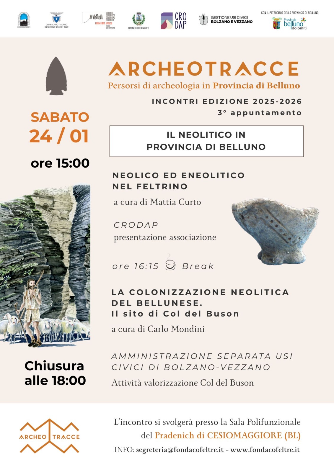 CESIOMAGGIORE Il 2026 del Fondaco per Feltre si apre con la promozione dell’archeologia bellunese attraverso il ciclo di incontri “Archeotracce”. Il terzo appuntamento è in programma sabato alle 15 nella Sala Polifunzionale di Pradenich a Cesiomaggiore, ed è dedicato al Neolitico in provincia di Belluno. L’incontro approfondirà ricerca archeologica, valorizzazione del territorio e ruolo delle comunità locali. L’archeologo Mattia Curto presenterà i siti neolitici ed eneolitici del Feltrino, seguito dalla testimonianza divulgativa del collettivo CRODAP. Nel pomeriggio il professor Carlo Mondini illustrerà la colonizzazione neolitica del Bellunese e il sito di Col del Buson, con il contributo delle comunità locali. L’ingresso è libero fino a esaurimento posti.
