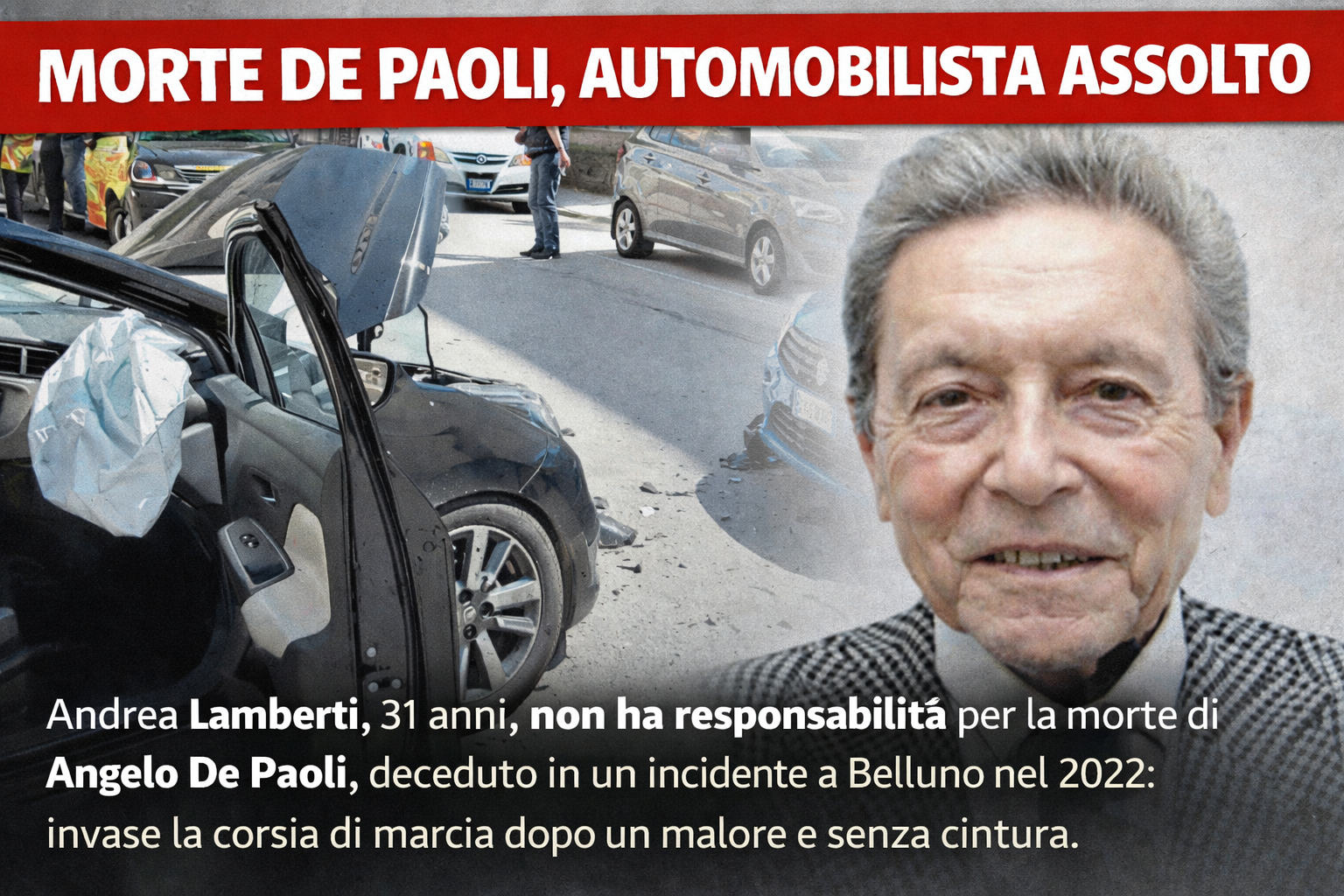 Assolto perché il fatto non costituisce reato: il 31enne di Belluno, non ha responsabilità per la morte di Angelo De Paoli, 86 anni, deceduto dopo un incidente nel maggio 2022 in via Feltre. Secondo quanto emerso da perizie e autopsia, De Paoli fu colto da malore, invase la corsia opposta e non indossava la cintura di sicurezza. Lamberti procedeva regolarmente sulla sua corsia e non avrebbe avuto il tempo materiale per evitare l’impatto. Dopo quattro anni di accertamenti, anche la Procura ha chiesto l’assoluzione, escludendo negligenze alla guida. Il giudice ha confermato: nessuna colpa per l’imputato, il decesso è legato alle condizioni della vittima e alla dinamica inevitabile dell’incidente.