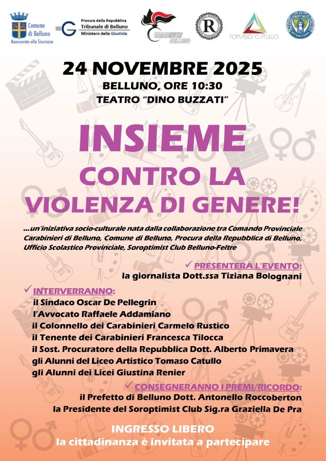 BELLUNO Lunedì il Teatro “Dino Buzzati” di Belluno ospiterà l’iniziativa Insieme contro la violenza di genere, evento promosso da Comune, Procura, Carabinieri, Ufficio Scolastico Provinciale e Soroptimist. Alle 10:30 la giornalista Tiziana Bolognani aprirà l’incontro, che vedrà gli interventi del sindaco Oscar De Pellegrin, dell’avvocato Raffaele Addamiano e dei rappresentanti dell’Arma, tra cui il colonnello Carmelo Rustico. Protagonisti anche gli studenti dei licei Catullo e Renier, coinvolti con contributi artistici e testimonianze. La cerimonia si concluderà con la consegna dei premi da parte del prefetto Antonello Roccoberton e della presidente Soroptimist Graziella De Pra. L’ingresso è libero e la cittadinanza è invitata a partecipare.
