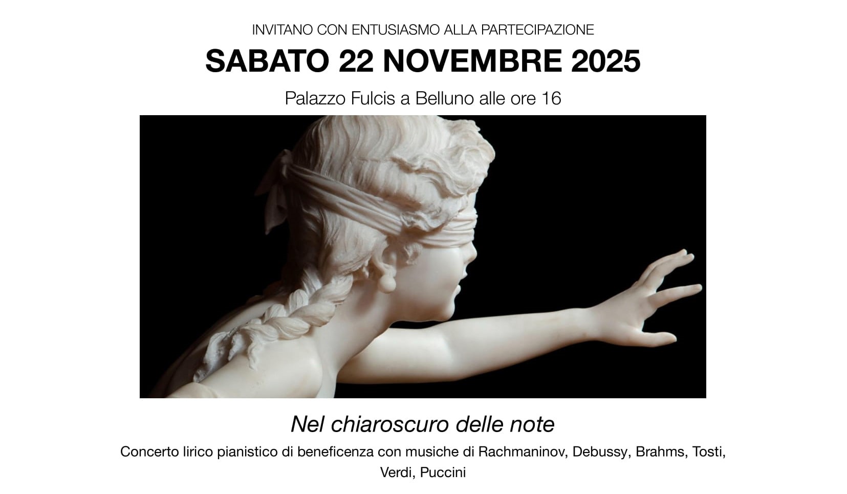BELLUNO Sabato, alle 16.00, il Piano Nobile di Palazzo Fulcis ospiterà la seconda edizione di “Nel chiaroscuro delle note”, concerto lirico-pianistico di beneficenza a favore dell’Unione Italiana dei Ciechi e degli Ipovedenti di Belluno. L’iniziativa, organizzata dal Comune di Belluno con il supporto dell’Assessorato alla Cultura e della Fondazione Efesto, propone un pomeriggio di musica e solidarietà. Il pianista cieco Filippo Visentin aprirà l’evento con un programma dedicato ai grandi maestri romantici. A seguire, il soprano Rosanna Lo Greco interpreterà celebri arie d’opera. L’ingresso è gratuito con prenotazione obbligatoria all’indirizzo: [email protected].