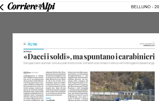 SETTEVILLE Due uomini extracomunitari sono stati arrestati in flagranza dai carabinieri di Feltre per estorsione ai danni di un giovane residente a Setteville. Non si accontentavano del pagamento della droga ceduta in precedenza, ma pretendevano denaro extra minacciando violenze fisiche. Dopo la denuncia del ragazzo, già vittima di botte e intimidazioni, i militari hanno organizzato un appostamento: i due sono stati bloccati mentre riscuotevano altri 200 euro. Difesi dagli avvocati Coppa e Sperandio, si sono avvalsi della facoltà di non rispondere. Per loro è stato disposto il divieto di avvicinamento, difficile da rispettare vista la vicinanza delle abitazioni. In valutazione obbligo di firma o altre misure cautelari. L’estorsione prevede pene da cinque a dieci anni: la vittima potrà costituirsi parte civile per il risarcimento dei danni.