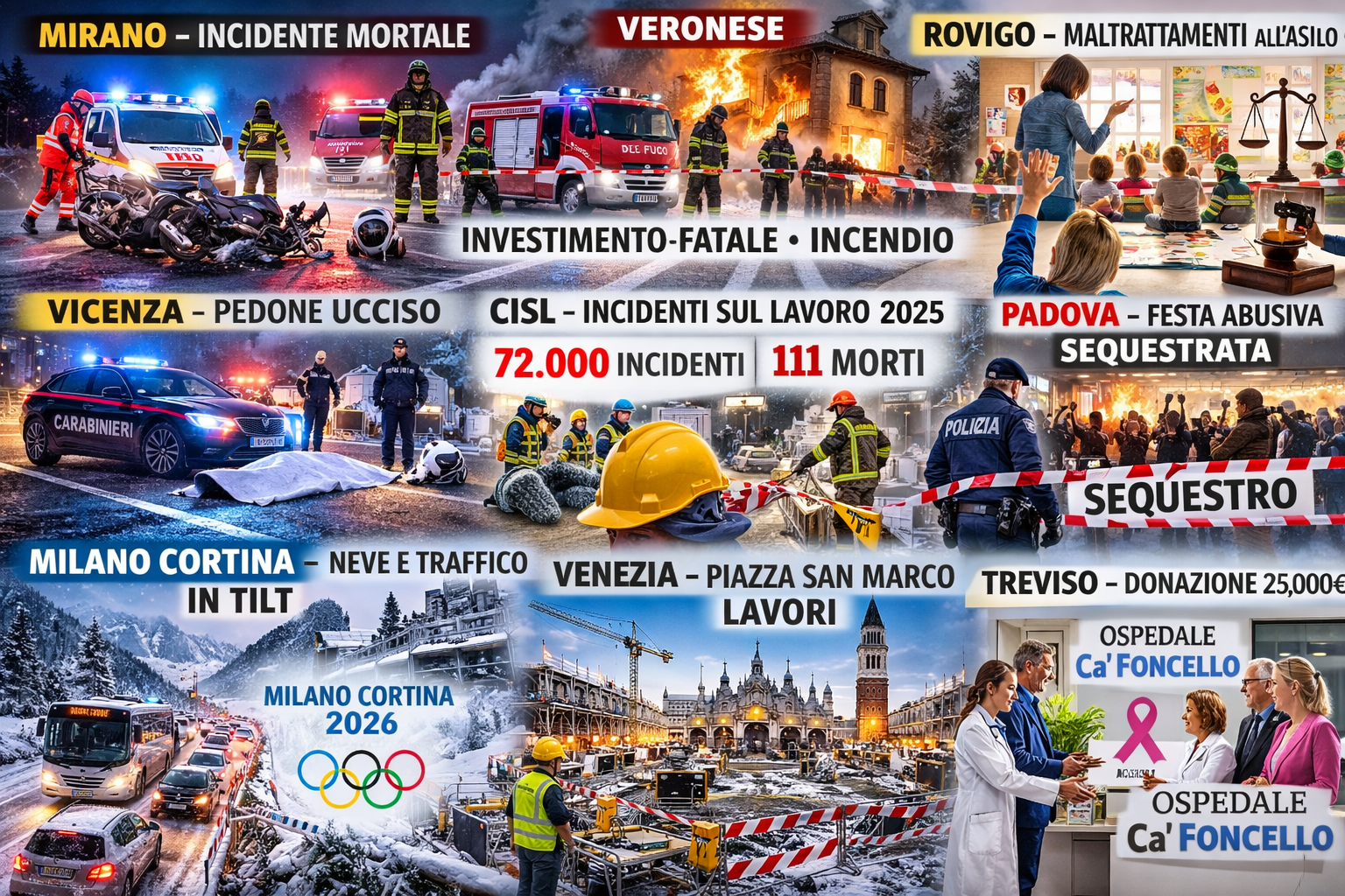 MESTRE Non si ferma la crescita degli infortuni sul lavoro in Veneto. Nel 2025 le denunce all’Inail sono state 71.867, +2,4% rispetto al 2024 e dato più alto degli ultimi cinque anni escluso il periodo pandemico: il 3,23% degli occupati ha subito un infortunio. Lo rileva lo studio della Fondazione Corazzin per conto della Cisl Veneto. I casi in occasione di lavoro sono 60.237, quelli in itinere 11.630. Preoccupano i decessi: 111 nel 2025, in aumento dopo il calo del 2024, con picco tra i 45-54 anni (42 vittime). Crescono anche le malattie professionali (5.990, +8,7%), soprattutto osteomuscolari. Aumentano gli infortuni a Padova e Verona, mentre calano a Belluno e Rovigo; quest’ultima però registra più morti. Colpiti soprattutto uomini e lavoratori stranieri. Tra i settori più esposti metalmeccanica, costruzioni e commercio. La Cisl chiede più prevenzione, formazione e controlli.