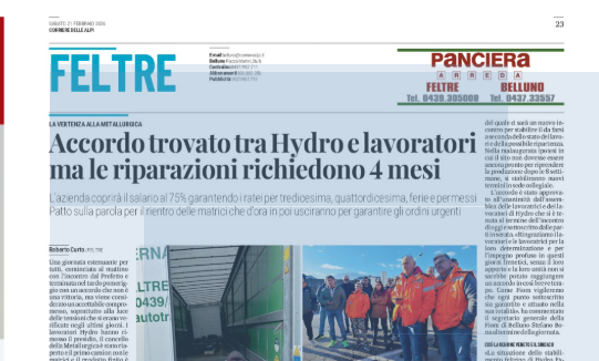 FELTRE Nel pomeriggio di ieri è stato raggiunto un accordo sul futuro del sito produttivo di Feltre di Hydro, al termine di una lunga giornata di incontri tra azienda, sindacati e istituzioni, dopo il presidio, il tavolo in prefettura e l’assemblea di sito. L’intesa punta a garantire tutele immediate ai lavoratori, fortemente preoccupati dopo le recenti vicende legate all’incendio. L’azienda si è impegnata ad anticipare quasi integralmente la cassa integrazione a partire dal 10 febbraio, assicurando anche ferie, PAR, tredicesima e quattordicesima sin dal primo giorno. Sulla ripartenza produttiva sono previsti aggiornamenti settimanali sui lavori di ripristino. Eventuali spostamenti di matrici verso Oriago saranno concordati con le RSU e avranno una data certa di rientro a Feltre. Hydro ha confermato la volontà di cedere lo stabilimento, mantenendo attiva la ricerca di un acquirente. L’accordo, valido otto settimane, sarà verificato al termine del periodo. L’assemblea dei lavoratori ha approvato all’unanimità l’intesa. Il sindaco Viviana Fusaro ha parlato di impegni chiari e di una base concreta per il futuro del territorio.