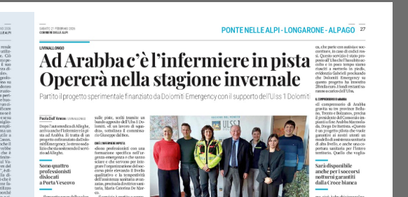 LIVINALLONGO E’ stato presentato il progetto di servizio sanitario territoriale integrativo nell’area Arabba-Fodom, promosso da Ulss Dolomiti in collaborazione con Dolomiti Emergency. L’iniziativa, attiva da gennaio a marzo 2026, prevede l’inserimento di un infermiere esperto in emergenza-urgenza direttamente nel comprensorio sciistico di Arabba, alla stazione a monte della funivia Porta Vescovo. L’obiettivo è aumentare la qualità e la rapidità degli interventi sanitari sulle piste, integrando il servizio con la Centrale Operativa SUEM 118 I numeri confermano la necessità del potenziamento: dal 10 dicembre 2025 al 19 febbraio 2026 si sono registrati 903 interventi in pista, di cui 115 con elisoccorso. Arabba concentra il 41,9% degli interventi provinciali . L’infermiere interviene nei casi di traumi e patologie tempo-dipendenti, occupandosi di valutazione primaria, stabilizzazione, gestione delle vie aeree, analgesia e immobilizzazione. Il servizio è attivo durante l’orario di apertura degli impianti, con disponibilità notturna per i casi più gravi. Il progetto è stato approvato con deliberazione del 28 gennaio 2026 e sostenuto da un contributo di 28 mila euro da parte di Dolomiti Emergency, destinato alla copertura del personale infermieristico. Un rafforzamento concreto del sistema di emergenza sulle piste, in un’area ad alta affluenza turistica invernale.