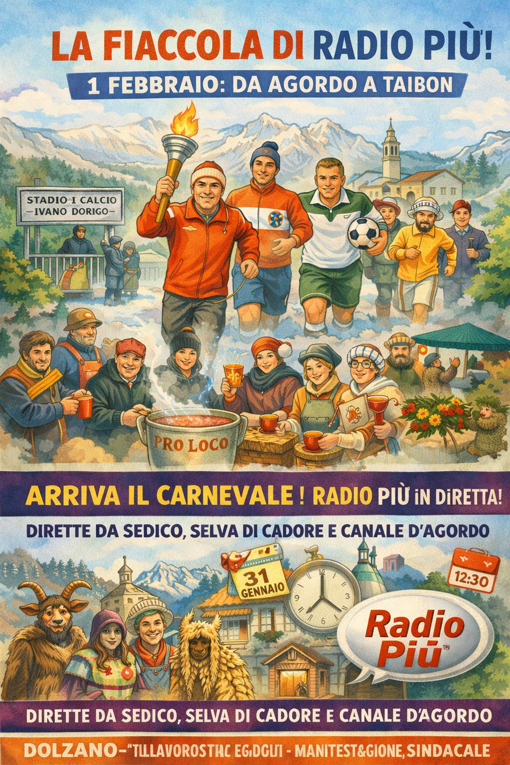 SEDICO Sedico si prepara a vivere un Carnevale 2026 ricco di eventi per grandi e piccini. Si parte sabato 31 gennaio al Palaskating con il Carnival Party anni ’80 e ’90, animazione, premi per le maschere più originali e chiosco con panini e cocktail, tutto trasmesso in diretta da Radio Più. Sabato 7 febbraio apre la mostra Carnevalarte con elaborati delle scuole sul tema “Un Carnevale… Olimpico”. Domenica 8 febbraio il tradizionale corso mascherato dei carri allegorici sedicensi vedrà la partecipazione del Corpo Musicale Comunale e animazione per bambini, sempre in diretta radiofonica. Sabato 14 e domenica 15 febbraio il Carnevale dei Bambini e il secondo corso mascherato proporranno sfilate, Heroebus a tema Avengers, animazione, diretta di Radio Più e spettacolo pirotecnico. Martedì 17 febbraio laboratori creativi per bambini. Sempre attivi chioschi, mini luna park, truccabimbi e lotteria con primo premio un buono viaggio da 1.000 euro.