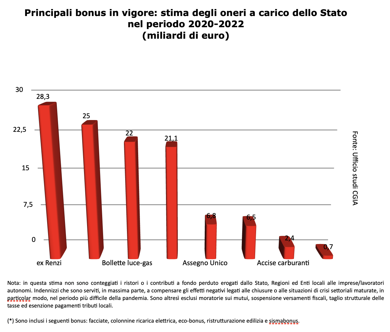 Quelli principali e ancora vigenti sono poco più una quarantina e in questo ultimo triennio (2020-2022) si stima che costeranno allo Stato almeno 113 miliardi di euro (per la precisione 112,7). Stiamo parlando dei bonus introdotti in buona parte dagli ultimi due esecutivi per fronteggiare gli effetti economici negativi provocati dalla pandemia e dalla guerra in Ucraina ad alcuni comparti produttivi, alle famiglie, ai lavoratori dipendenti e agli autonomi. L’analisi è stata effettuata dall’Ufficio studi della CGIA.