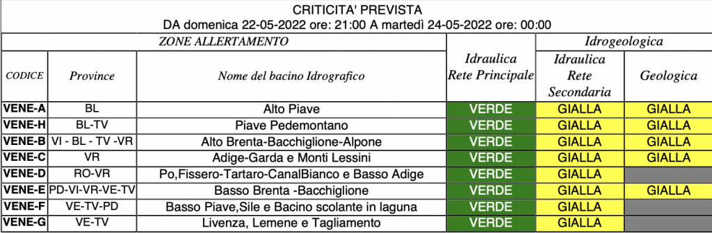 IN VENETO ALLERTA GIALLA PER CRITICITA’ IDROGEOLOGICA