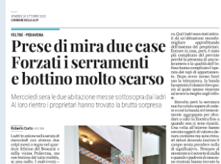 FELTRE Raid dei ladri mercoledì sera tra Boscariz e Pedavena, dove sono stati messi a segno due tentativi di furto. Nel primo caso, i malviventi hanno forzato un infisso di un’abitazione vicino alla parrocchia, mettendo tutto a soqquadro ma senza trovare nulla di valore. Nel secondo episodio, in via Crico a Pedavena, dopo aver danneggiato una telecamera e sfondato una finestra, i ladri sono entrati in casa ma sono fuggiti a mani vuote. In entrambi i casi indagano i Carabinieri di Feltre.