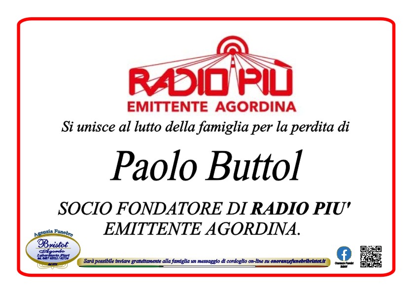 Radio Più si stringe con affetto alla figlia Silvia, a Edi, a Tiziana e a tutti i familiari. Con il cuore colmo di gratitudine, salutiamo Paolo come lo abbiamo sempre conosciuto: con un sorriso, una battuta pronta e una mano tesa. Grazie Paolo, per aver creduto in un sogno che continua a vivere ogni giorno nell’aria di questa radio.