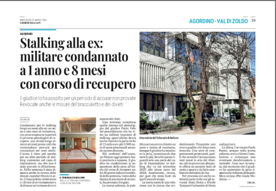 AGORDO – Un anno e otto mesi di reclusione per stalking nei confronti dell’ex compagna: è la condanna inflitta al militare 45enne, al termine di un processo che ha ricostruito un anno di comportamenti persecutori. Il giudice ha stabilito che l’uomo, dovrà seguire un percorso psicologico di recupero di almeno sei mesi: solo così potrà ottenere la sospensione della pena. Il corso dovrà iniziare entro 40 giorni. Secondo l’accusa, tra il settembre 2023 e il settembre 2024, l’imputato avrebbe messo in atto una serie di azioni tali da provocare nella vittima ansia, paura e un cambiamento delle abitudini di vita. Disposto anche un risarcimento di 13 mila euro, oltre alle spese legali. Revocate invece le misure cautelari, tra cui il braccialetto elettronico e il divieto di avvicinamento. Nella scorsa udienza la pubblica accusa aveva chiesto 1 anno e mezzo, quindi innalzando la pena di due mesi. Assoluzione, infine, per una parte delle accuse non provate. Una sentenza che conferma la gravità del reato, ma che punta anche su un percorso di recupero per prevenire nuovi episodi. Nel processo, la donna agordina si è costituita parte civile con gli avvocati Alain Dotta dello studio Dotta & Partners di Agordo. La difesa aveva chiesto l’assoluzione o derubricazione in molestie, il giudice ha risposto aumentando la pena della pubblica accusa (PM Giada Modena).