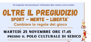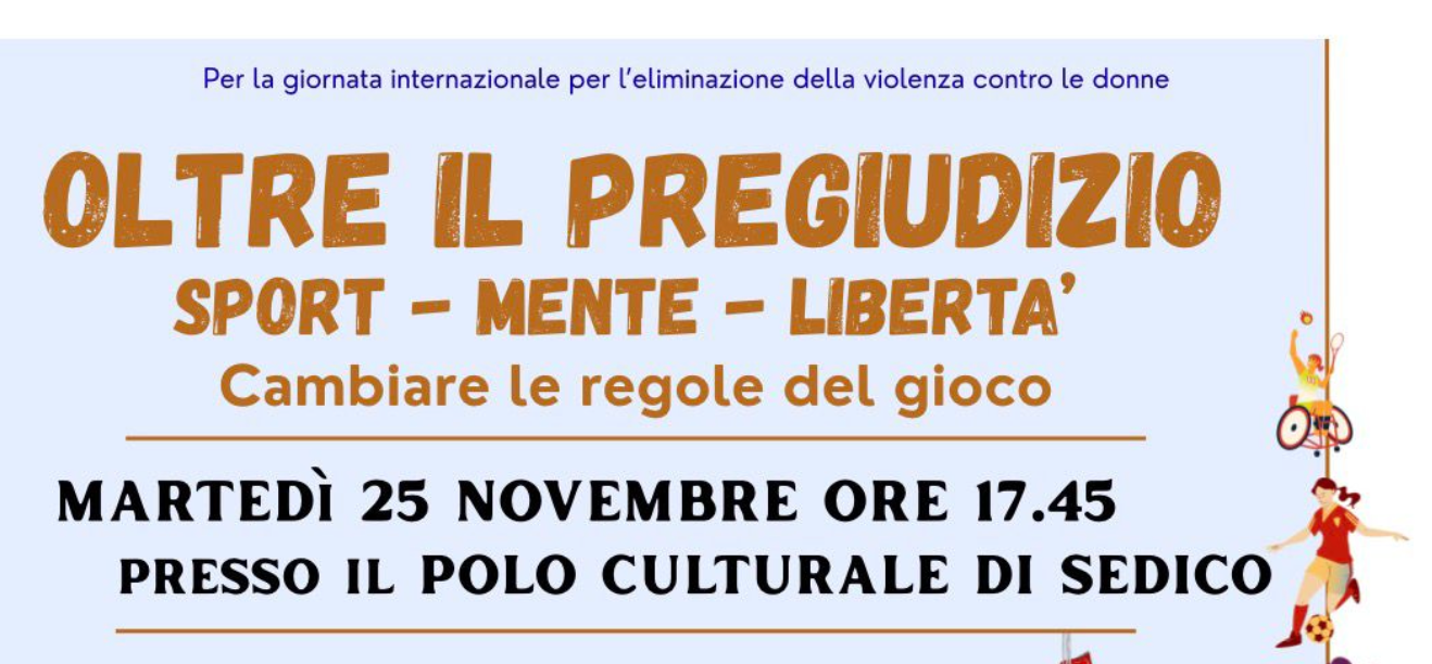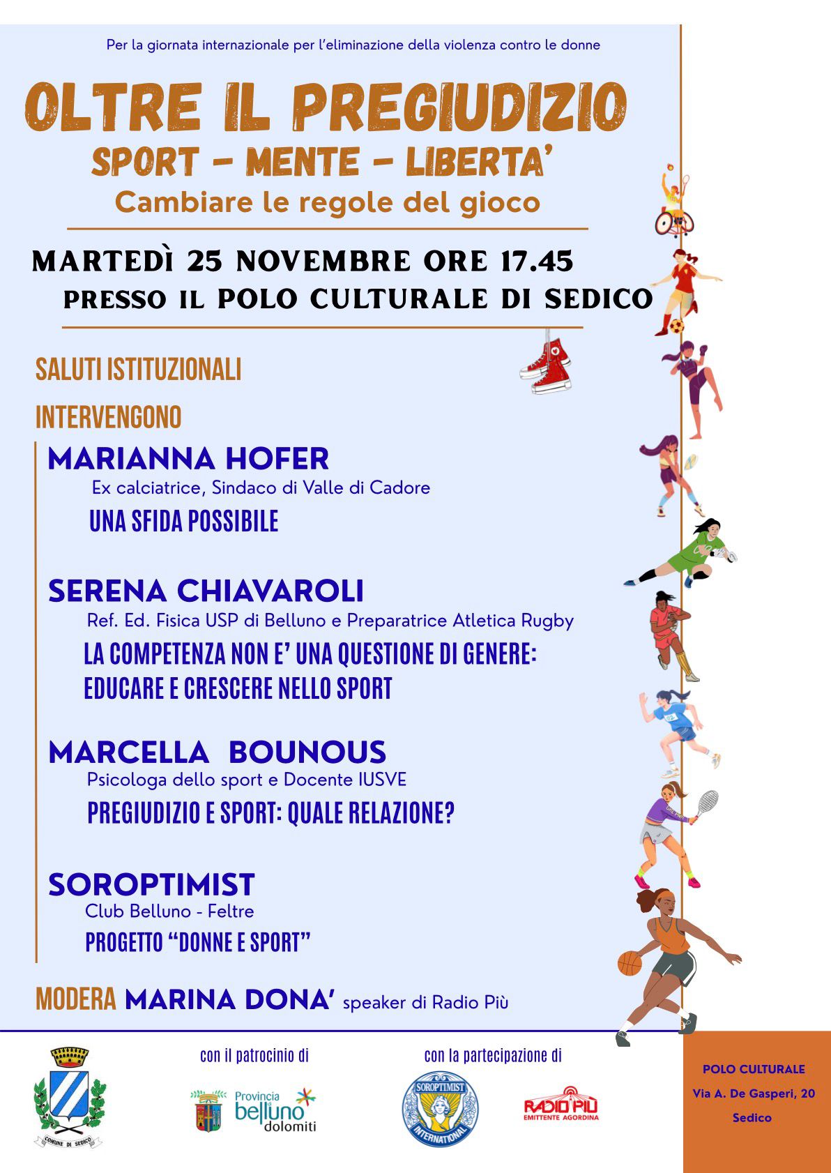 SEDICO In occasione della Giornata internazionale per l’eliminazione della violenza contro le donne, il Polo Culturale di Sedico ospiterà oggi alle 17.45 l’incontro “Oltre il Pregiudizio – Sport, Mente, Libertà”. L’evento, patrocinato dalla Provincia di Belluno e dal Soroptimist Club Belluno–Feltre, metterà al centro il valore educativo e sociale dello sport. Interverranno Marianna Hofer, ex calciatrice e sindaca di Valle di Cadore, Serena Chiavaroli, referente di educazione fisica e preparatrice atletica, e Marcella Bounous, psicologa dello sport. Le relatrici affronteranno temi come la parità di genere, la crescita attraverso la pratica sportiva e il legame tra pregiudizi e discipline atletiche. La serata sarà moderata da Marina Donà di Radio Più.