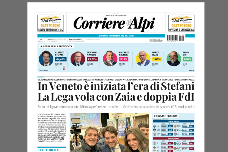 Le elezioni regionali in Veneto segnano una netta vittoria del centrodestra: Alberto Stefani supera il 64%, mentre Giovanni Manildo del centrosinistra si ferma poco sotto il 30%. L’astensionismo pesa fortemente sul risultato, con un’affluenza ferma al 44,64%. Nel pomeriggio, Stefani annuncia la vittoria sui social esprimendo “forte responsabilità ed energia” e promettendo un mandato caratterizzato da sobrietà e assenza di polemiche. Arriva subito anche il plauso di Giorgia Meloni, che attribuisce il successo al lavoro del centrodestra. Manildo, pur sconfitto, definisce il risultato «storico» per il centrosinistra veneto. In provincia di Belluno sono Fratelli d’Italia e la Lega i partiti più votati, trainati dalle numerose preferenze raccolte da Dario Bond e Silvia Calligaro, entrambi ai vertici delle scelte degli elettori. La Lega mantiene una presenza significativa, con Luca Zaia tra i candidati più apprezzati. Il risultato più netto arriva da Rocca Pietore, dove la Lega domina con il 69% dei voti: Andrea De Bernardin ottiene 187 preferenze, seguito da Silvia Cestaro con 116. Proprio Cestaro risulta la più votata anche ad Alleghe. Nei centri maggiori, come Belluno, Feltre e Cesiomaggiore, è invece Dario Bond a distinguersi come il candidato più premiato dagli elettori, confermando una forte affermazione personale nel territorio.