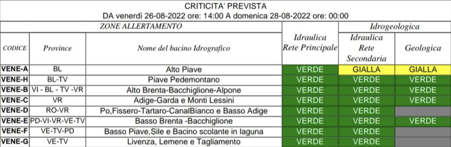 VENEZIA Il Centro Funzionale Decentrato della Protezione Civile della Regione del Veneto ha emesso un avviso in cui si prevede tempo per lo più instabile con possibili fenomeni di locali rovesci o temporali, che nella zona dolomitica non si esclude possano essere di forte intensità. Si prevede criticità idrogeologica, stabilendo fino alle 00.00 di domenica, lo stato di Attenzione (allerta gialla) per il bacino Alto Piave (BL). Il possibile verificarsi di rovesci o temporali localmente anche intensi, potrebbe creare disagi al sistema fognario e di drenaggio urbano e lungo la rete idrografica minore. Si segnala la possibilità d’innesco di fenomeni franosi superficiali sui versanti e la possibilità di innesco di colate rapide specie nella zona di allertamento di Vene-A.