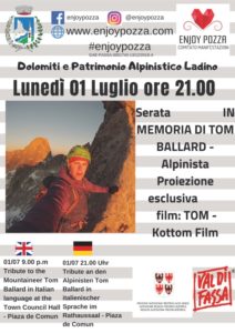 POZZA DI FASSA Lunedì 1 luglio 2019, alle 21 presso la sala Consiliare, del Comune di Sen Jan/Pozza di Fassa, si terrà la serata evento con proiezione esclusiva del film documentario TOM, in memoria dell’alpinista scozzese Tom Ballard, deceduto il 25 febbraio scorso mentre tentava l’ascensione dello Sperone Mummery al Nanga Parbat, in Pakistan. Tom Ballard ha vissuto diversi anni in Val di Fassa, lasciando evidenti tracce della sua grande capacità ed attività alpinistica. Figlio di Alison Hargreaves, prima donna a scalare l’Everest senza ossigeno, poi scomparsa scendendo dal K2, era considerato uno dei grandi talenti dell’alpinismo mondiale. Forza e capacità alpinistiche che aveva espresso realizzando in pochi mesi la salita delle sei pareti nord più impegnative delle Alpi. Una vita avventurosa quella di Tom, come era desiderio congiunto della madre e del padre Jim, che verrà ripercorsa attraverso la proiezione, del film TOM, realizzato nel 2015 dal regista spagnolo Angel Esteban ed Elena Goatelli. In quarantacinque minuti di riprese si racconta la vita dell’alpinista scomparso sul Nanga Parbat. Un documento unico, che ora con la morte di Tom Ballard, acquista ancora più valore. Il film è in lingua inglese con sottotitoli in italiano, ha partecipato ai maggiori film festival della montagna mondiali dove è stato sempre premiato tra le migliori opere in concorso. Tom Ballard considerava la Val di Fassa, la sua casa, non solo alpinisticamente parlando ma anche per il legame personale che aveva con Stefania Pederiva, sua compagna di vita e roccia.
