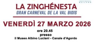 CANALE D’AGORDO Stasera alle 20.45, presso il Museo Albino Luciani, la comunità è invitata a rivivere la magia del Gran Carnevale della Val Biois con “La Zinghénesta”. L’evento propone la proiezione di un filmato dedicato alla partecipazione del gruppo al Carnevale di Venezia, dove ha rappresentato le tradizioni locali in Piazza San Marco. L’iniziativa sarà un’occasione per condividere emozioni e immagini di una giornata speciale, valorizzando il patrimonio culturale della valle. Un momento di incontro aperto a tutta la cittadinanza, nel segno della memoria, dell’identità e dell’orgoglio per una tradizione che continua a farsi conoscere anche nei contesti più prestigiosi.