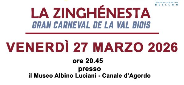 CANALE D’AGORDO Stasera alle 20.45, presso il Museo Albino Luciani, la comunità è invitata a rivivere la magia del Gran Carnevale della Val Biois con “La Zinghénesta”. L’evento propone la proiezione di un filmato dedicato alla partecipazione del gruppo al Carnevale di Venezia, dove ha rappresentato le tradizioni locali in Piazza San Marco. L’iniziativa sarà un’occasione per condividere emozioni e immagini di una giornata speciale, valorizzando il patrimonio culturale della valle. Un momento di incontro aperto a tutta la cittadinanza, nel segno della memoria, dell’identità e dell’orgoglio per una tradizione che continua a farsi conoscere anche nei contesti più prestigiosi.